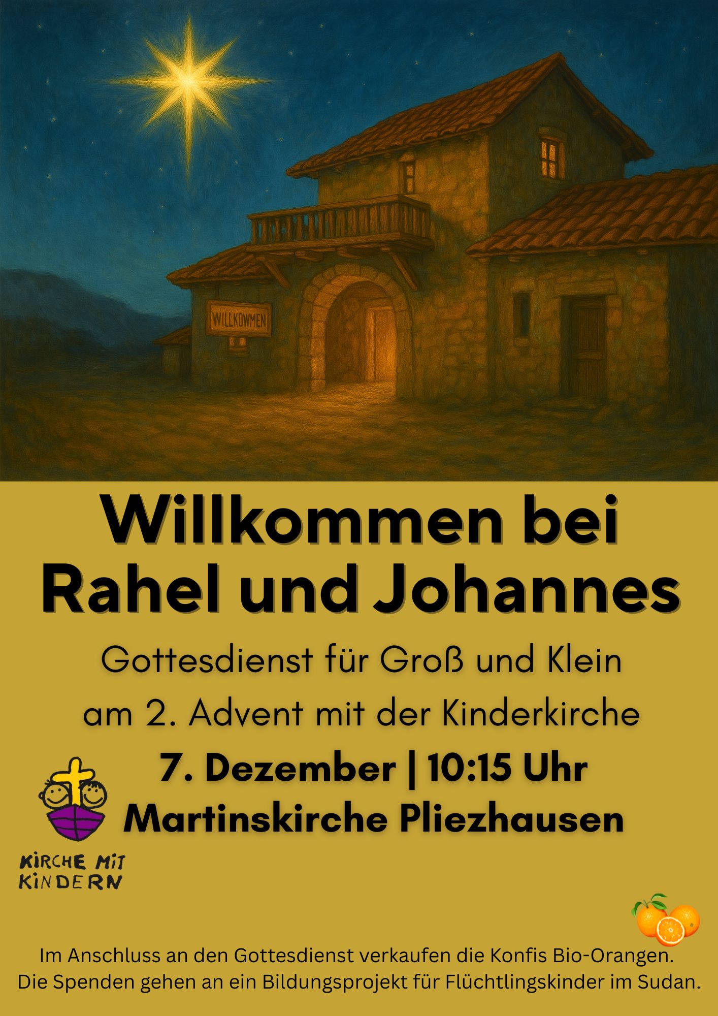 Ev. Martinskirche Pfarrgasse 3, PliezhausenWillkommen bei Rahel und Johannes! Herzliche Einladung zum Gottesdienst am 2. Advent mit einem Krippenspiel der Kinderkirche.