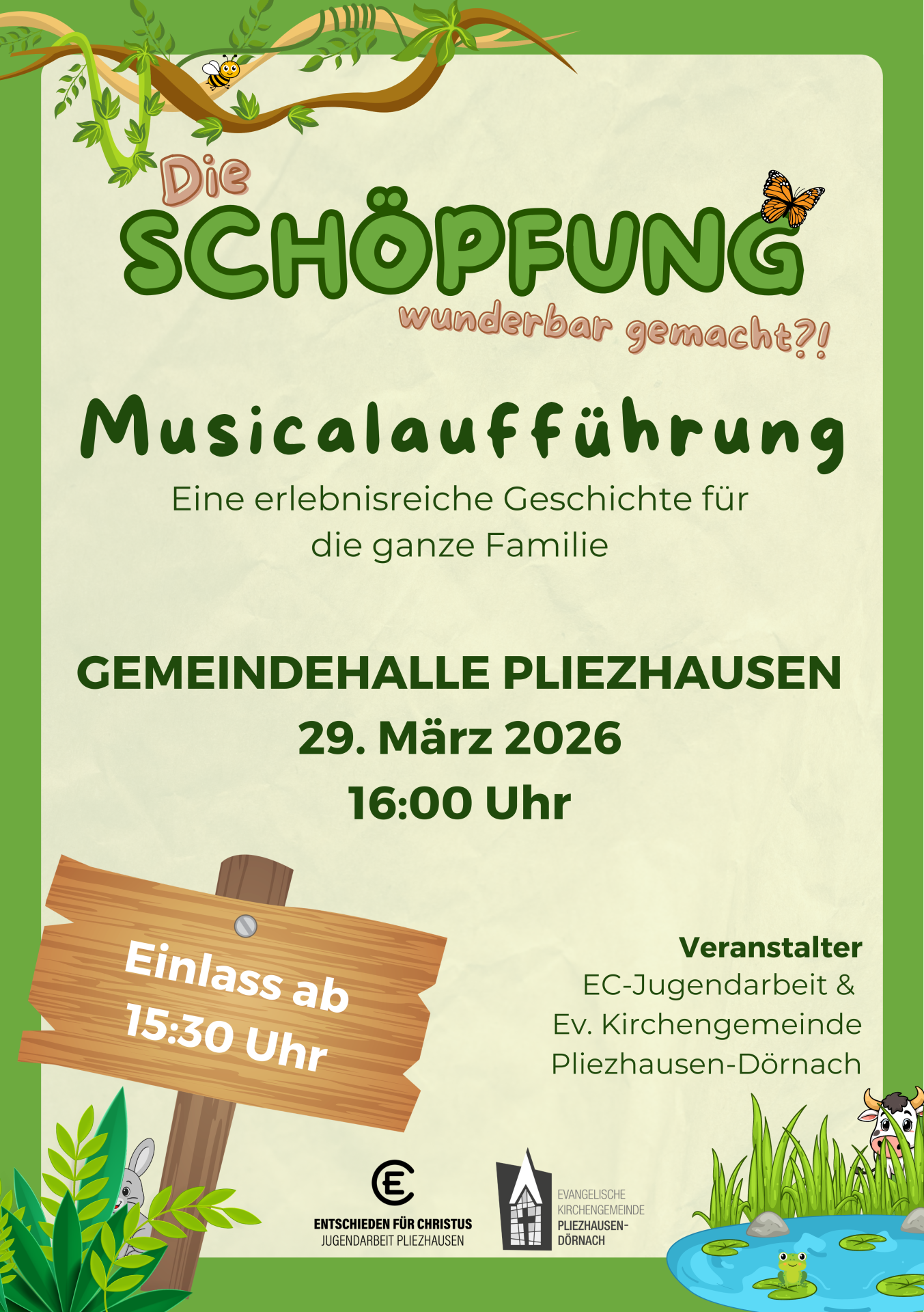 Gemeindehalle Pliezhausen Friedrichstraße 50, PliezhausenEin toller Nachmittag für die ganze Familie erwartet Euch! 40 Kinder bringen das Musical "Die Schöpfung. Wunderbar gemacht?!" auf die Bühne. Seid dabei! Wo? Gemeindehalle Pliezhausen Wann: Sonntag, 29. März […]